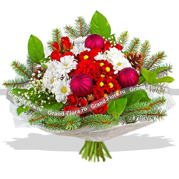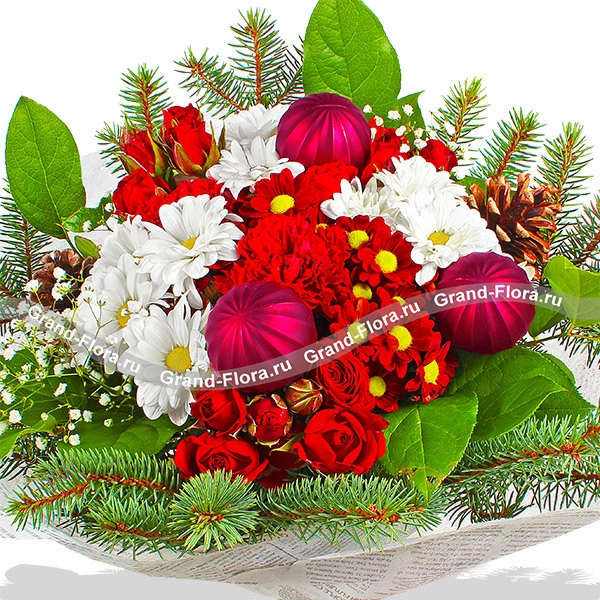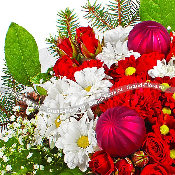 Стандартный (на фото): хризантема красная кустовая - 3шт., хризантема белая кустовая - 3шт., гвоздика красная - 3шт., роза красная кустовая - 2шт., гипсофила - 2шт., еловая ветвь, новогодний декор и зелень, фетр белый.
