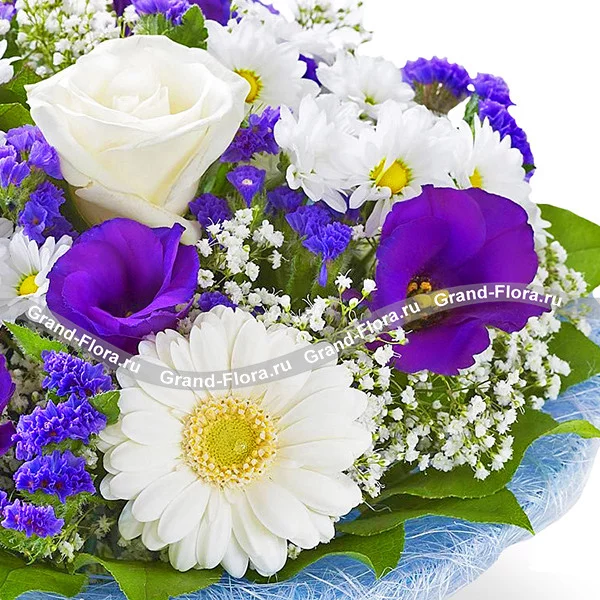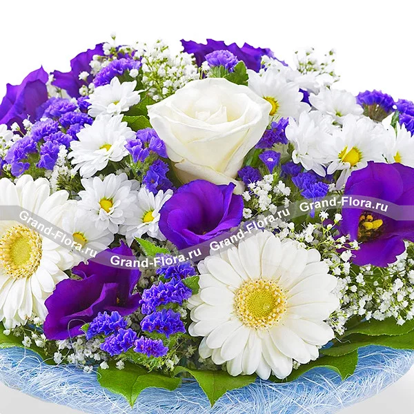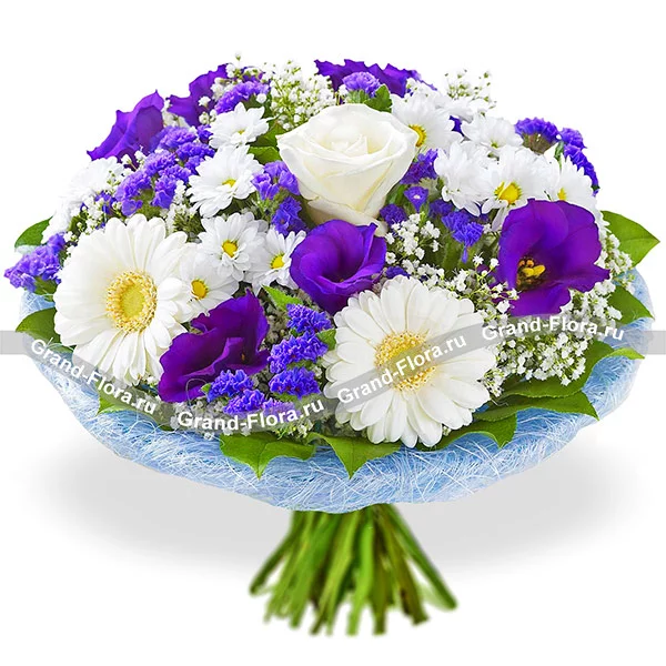 Стандартный: роза белая - 3 шт.,гербера белая - 4 шт., хризантема кустовая белая - 3 шт., эустома фиолетовая - 3 шт.,статица фиолетовая - 5 шт., гипсофила - 3 шт., салал - 3 шт., фетр голубой.